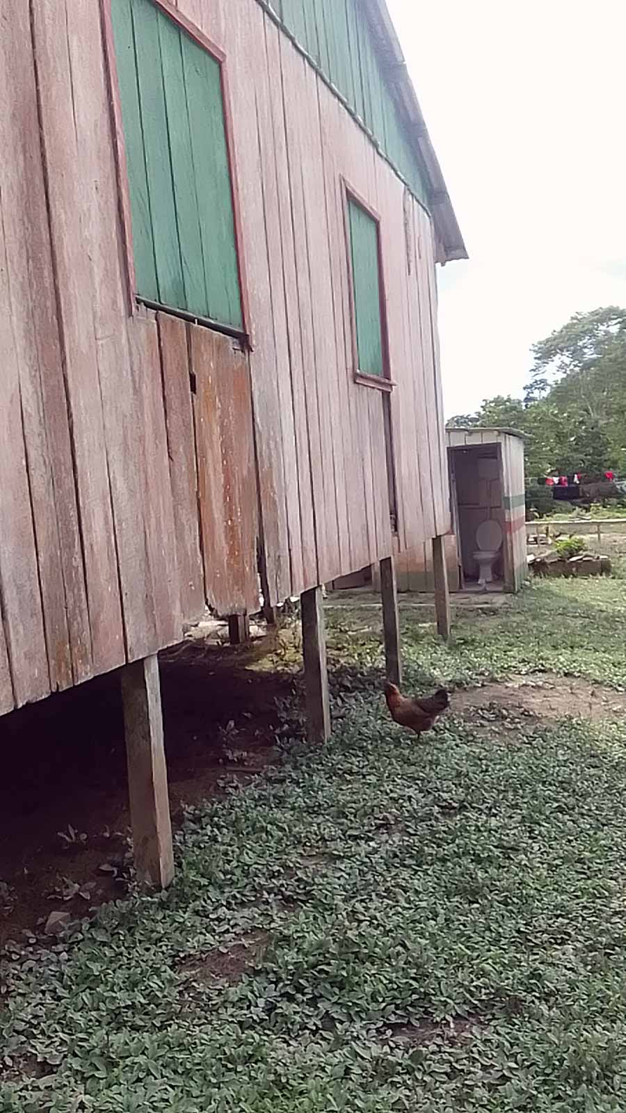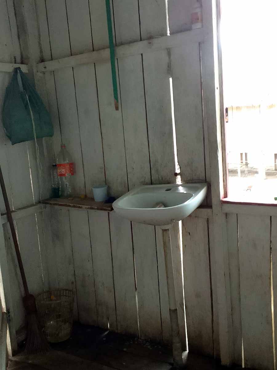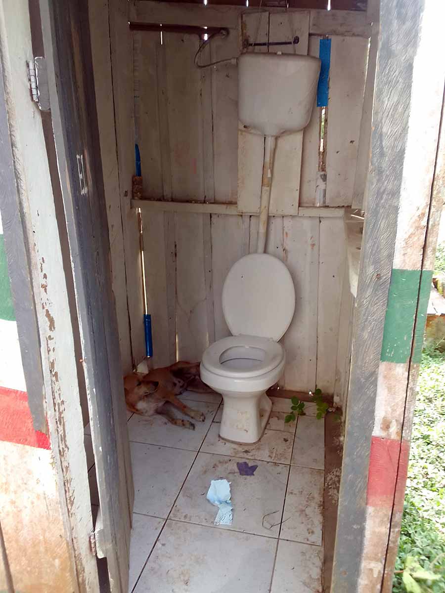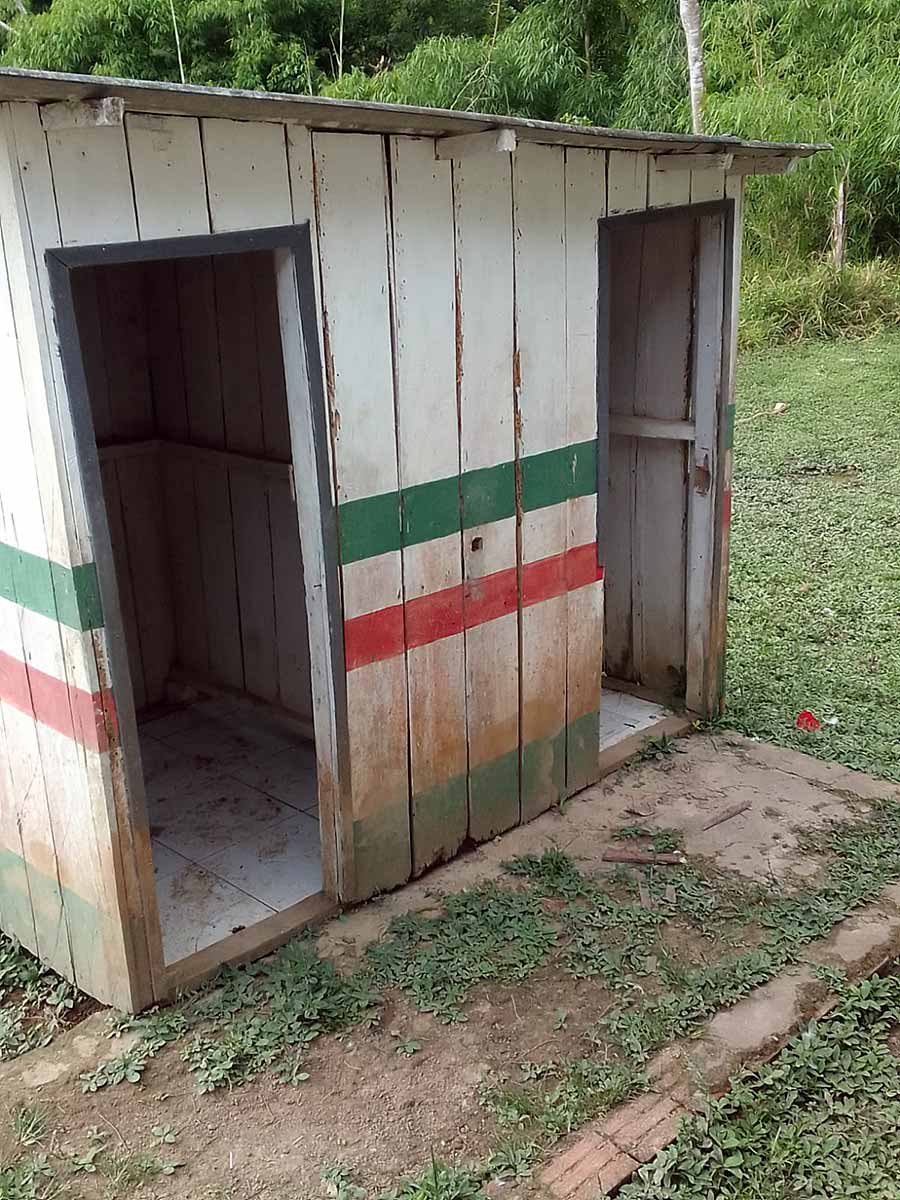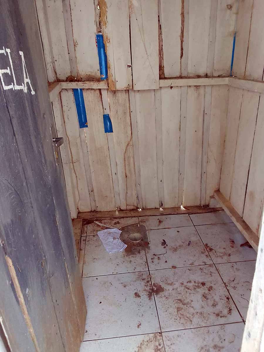 A estrutura é precária. O banheiro não oferece qualquer condição de uso. A fossa no quintal da escola é coberta com tábuas podres, o que põe em risco a vida dos alunos.