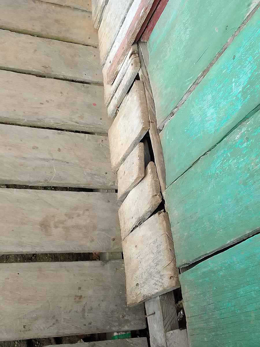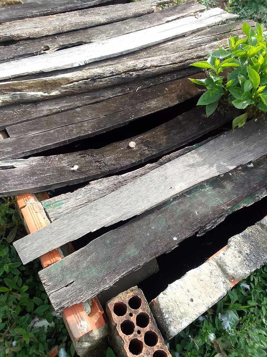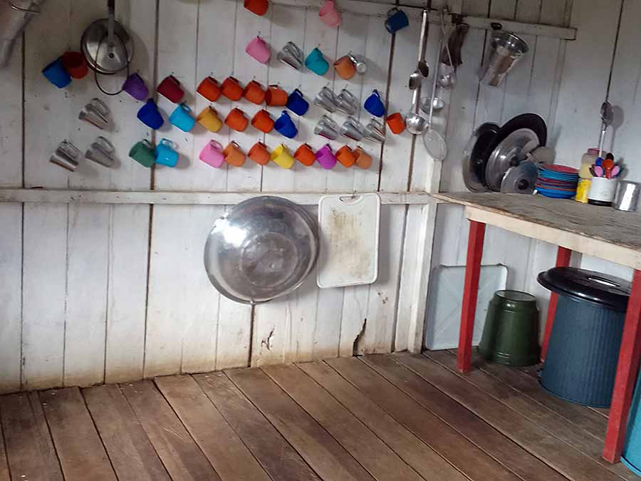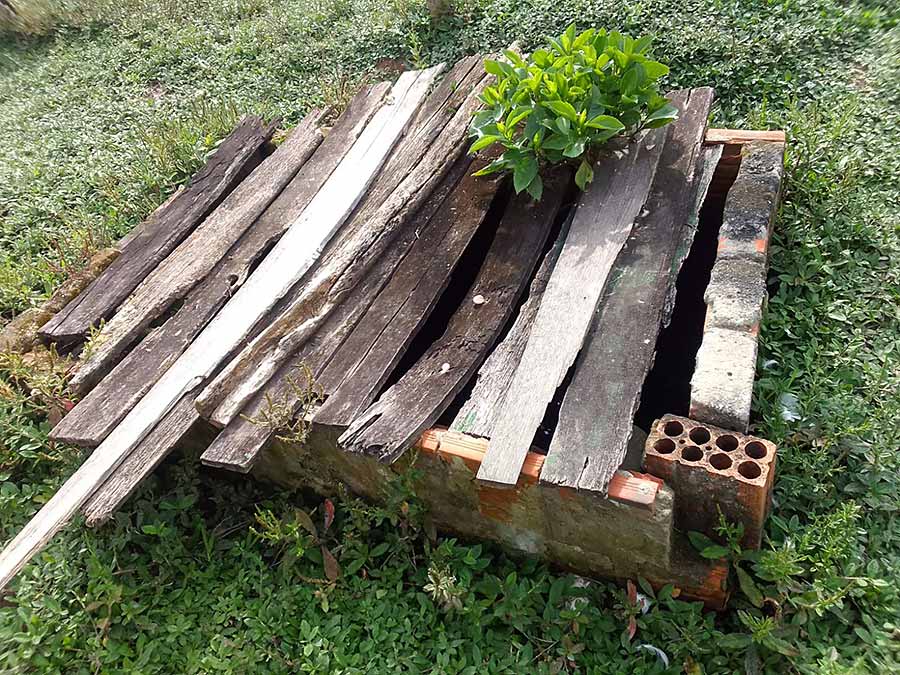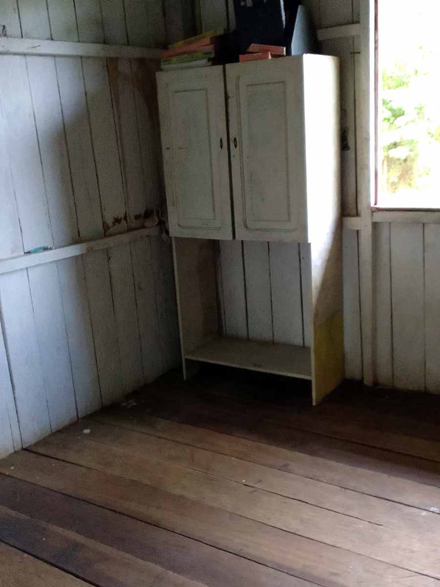 A estrutura é precária. O banheiro não oferece qualquer condição de uso. A fossa no quintal da escola é coberta com tábuas podres, o que põe em risco a vida dos alunos.